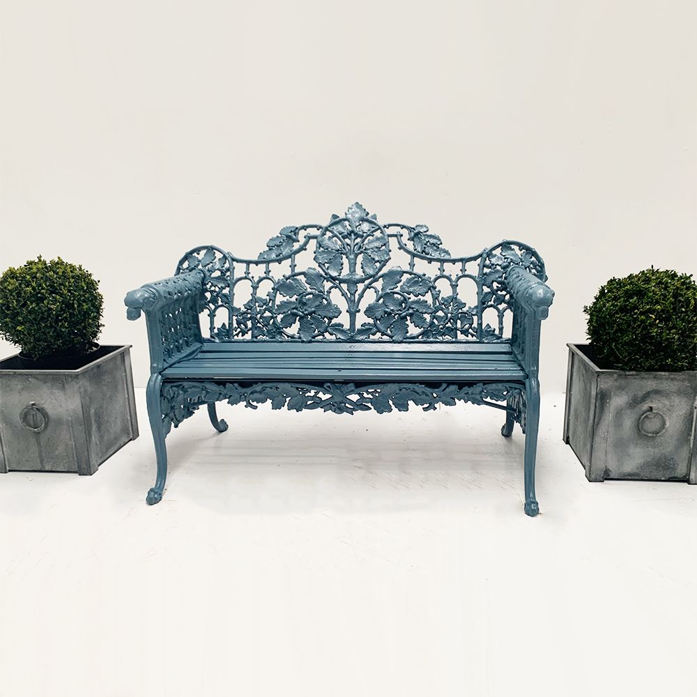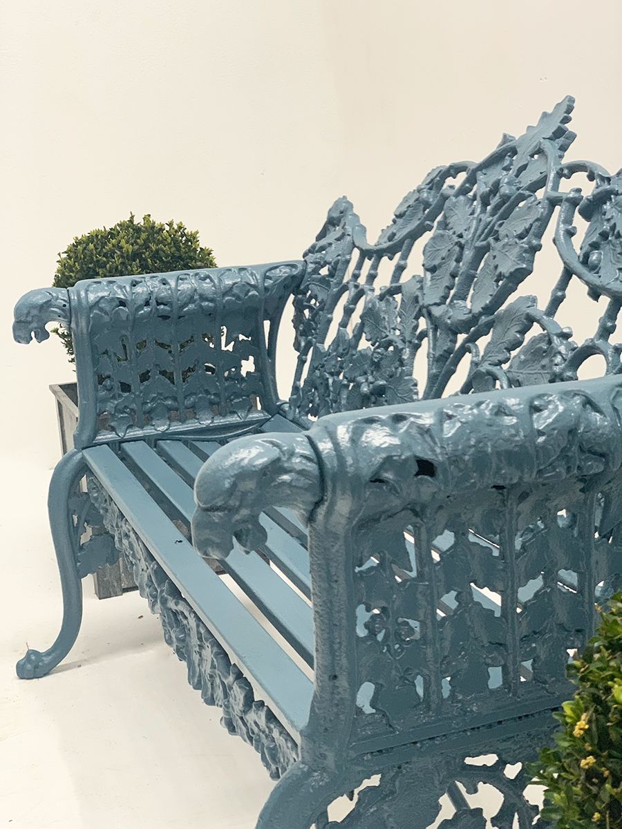 Splendid dog head cast iron 2 1/2 seat garden bench in the style of Coalbrookdale, with beautiful oak and ivy cast iron detailing.
