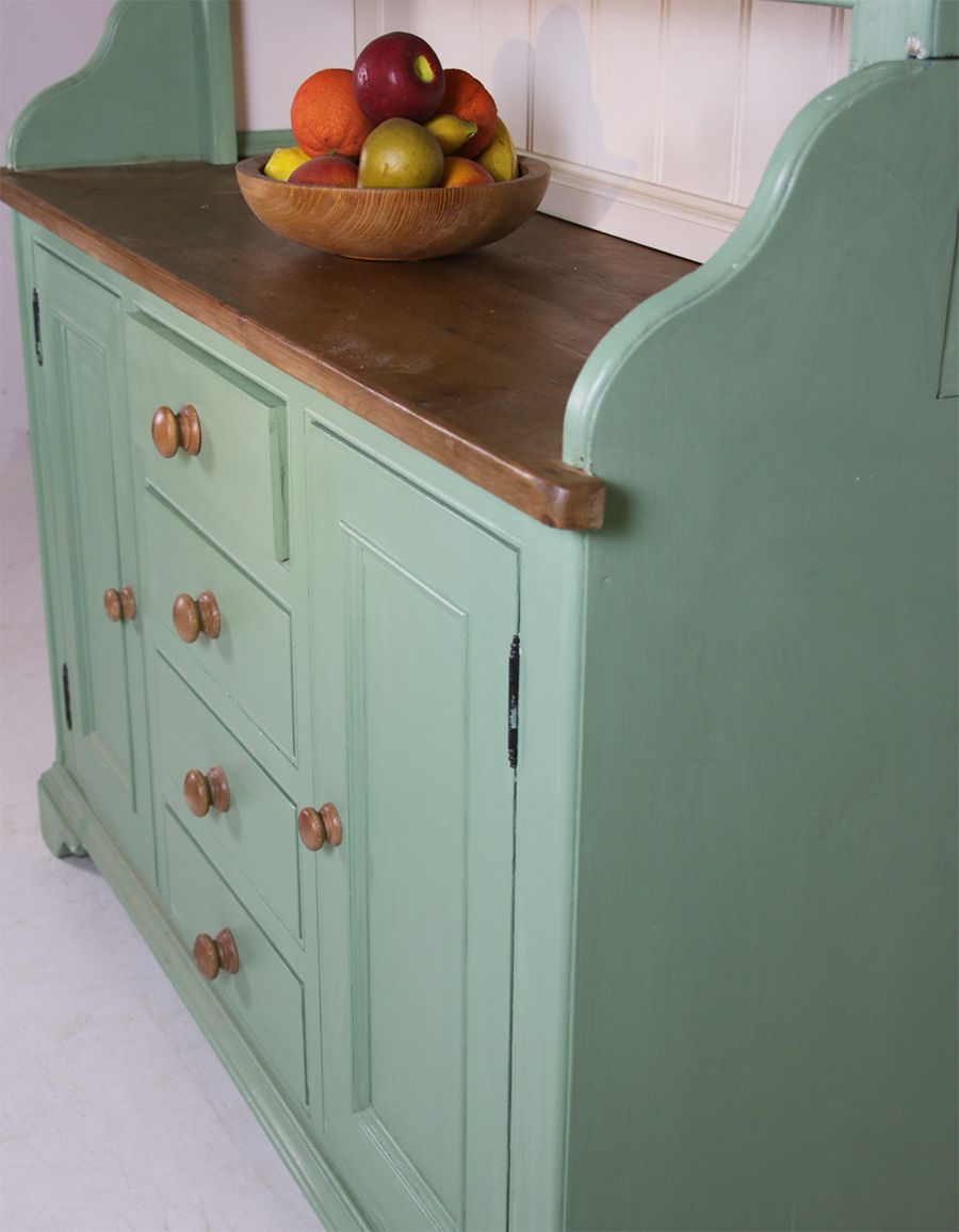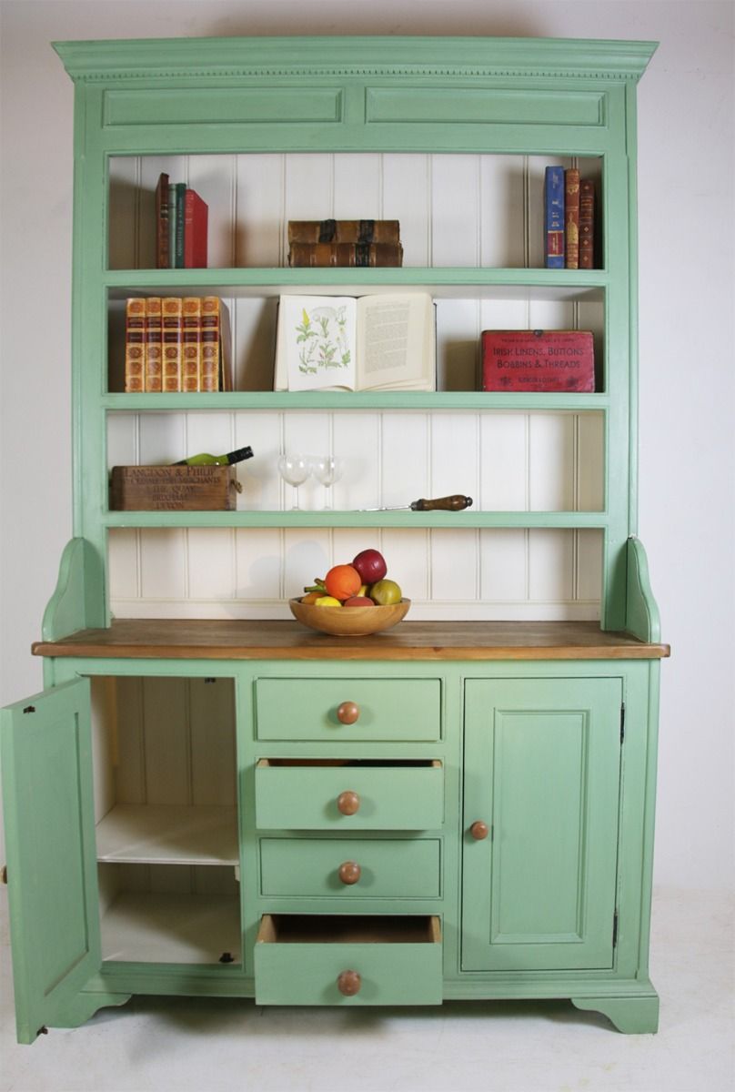 Beautiful green painted dresser with 3 shelves on top and 4 drawers, 2 cupboards below wooden round handles finished with cornicing to top