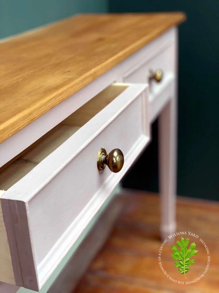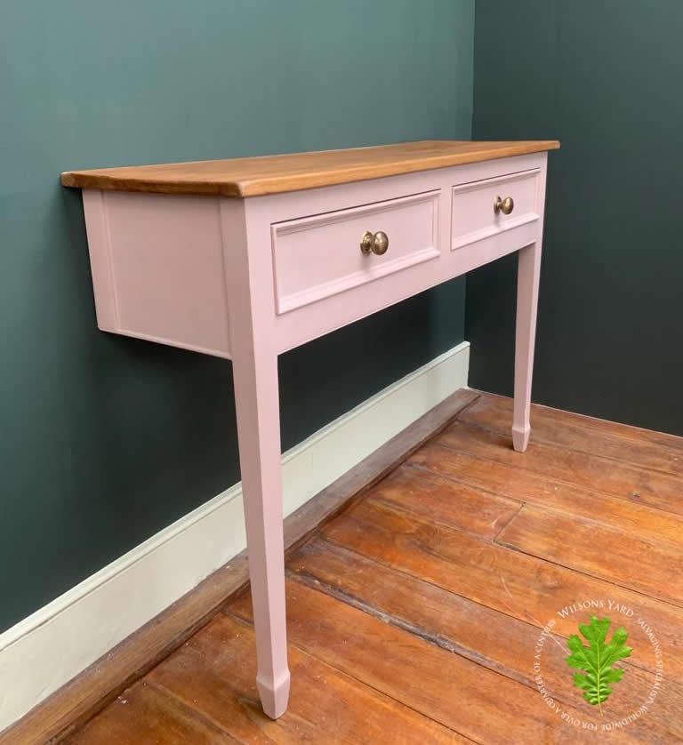Petite console table with reclaimed pine top, 2 drawers and tapered legs with spade feet. The table had two legs so will sit tight to the wall avoiding spirting board. Finished in Farrow and ball Sulking room pink.