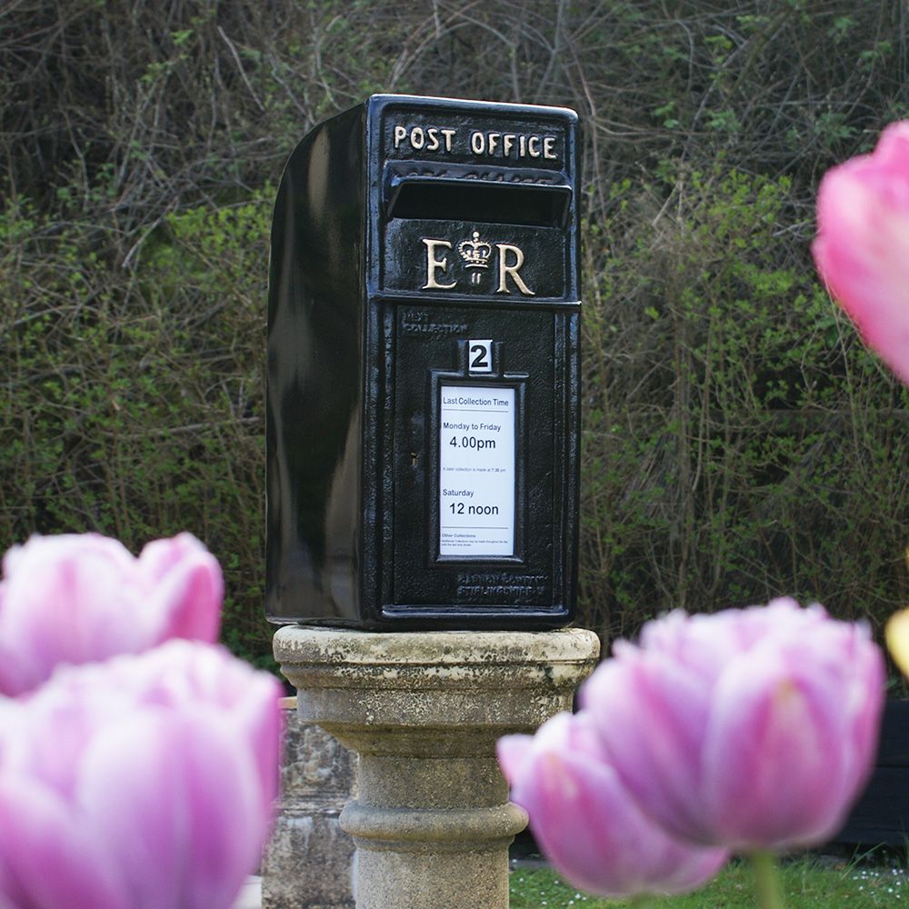 Black period style Royal Mail post box with cast iron front "ER". Complete with 2 keys and collections labels.