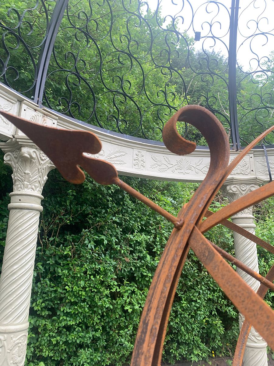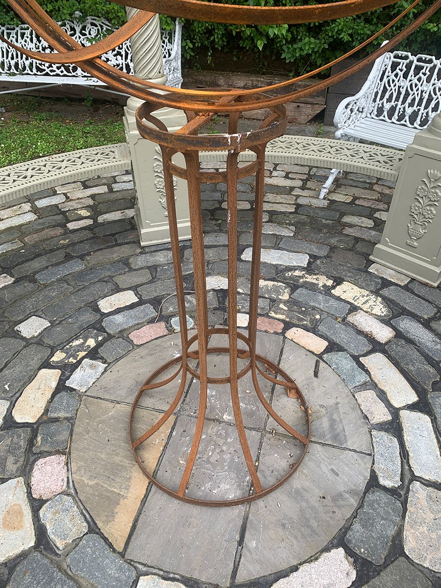 Blacksmith forged Armillary sphere garden sculpture, with enclosed smaller revolving sphere, on metal plinth.