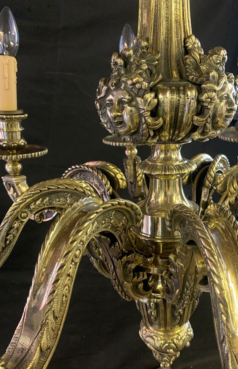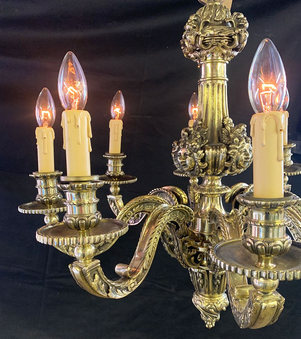 Decorative brass chandelier of superb quality with cherub detailing in the classical Empire style, supporting 8 candles.