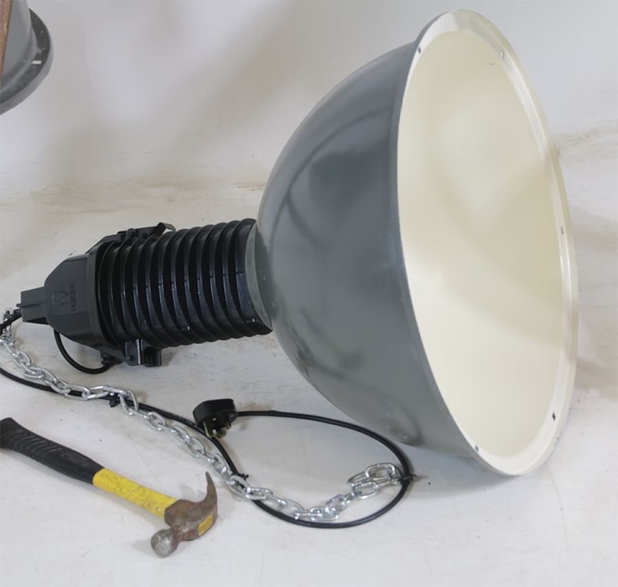 Restored vintage Philips industrial lights, salvaged from an old mill in Derry / Londonderry