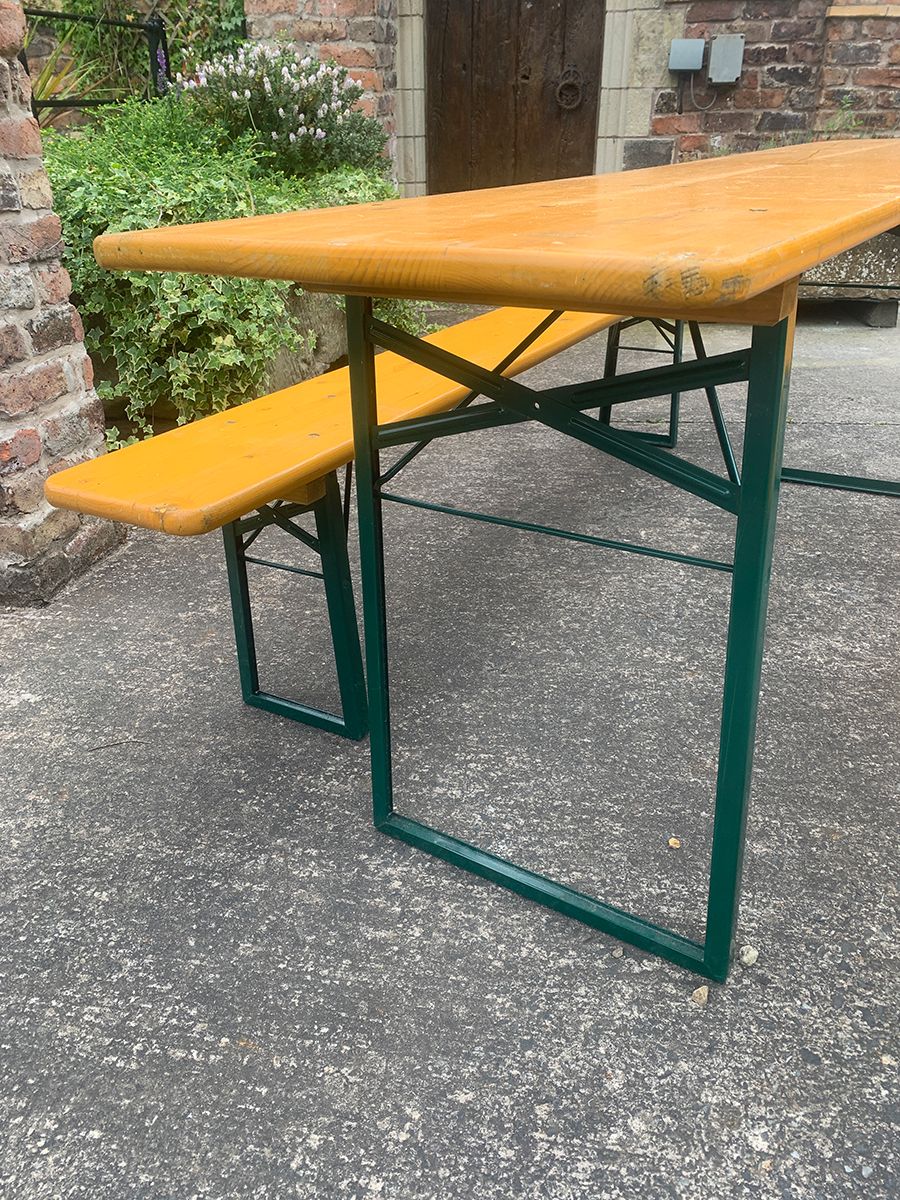 Fantastic German beer Keller table with two benches, ideal for turning your garden into a beer festival experience. Folding away within two minutes into three planks, these retro tables and benches are ideal for storage.