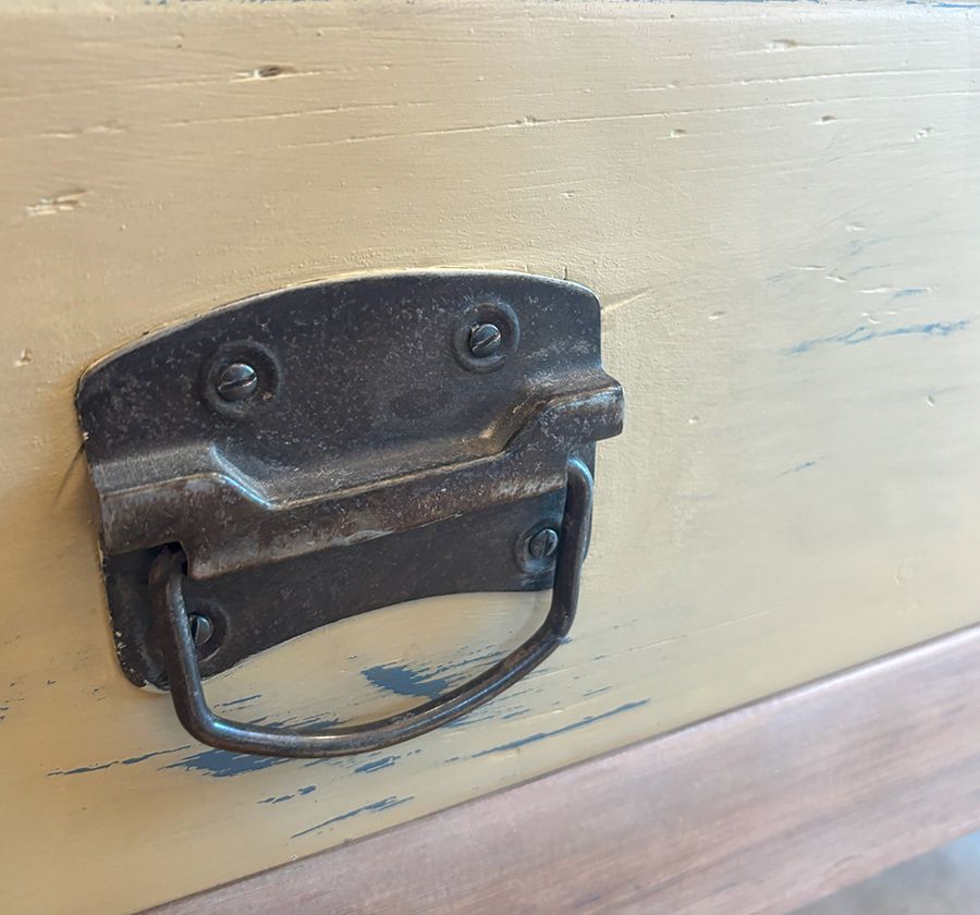 Fantastic 2 drawer antique butchers block of large proportions. Standing on raised metal legs, with pull out dovetail drawers finished in a distressed colour.