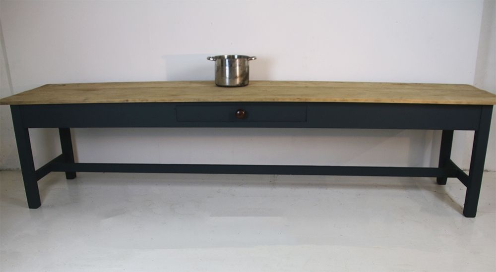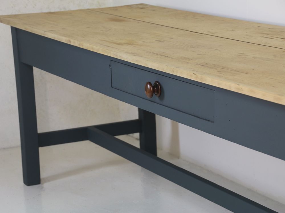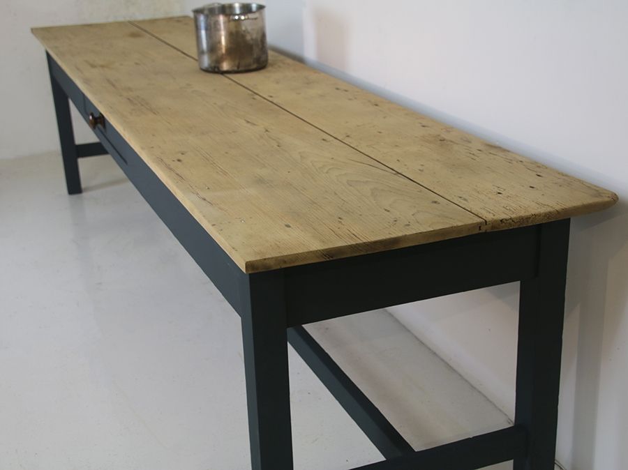 Beautifully restored original turn of the century Irish dairy table with stretcher base / central drawer and a very wide plank top. Comprising only 2 individual wide Pine boards. Attributed to "Woods diary, Hillsborough", famous for its homemade Ice Creams. Would make a lovely side table or Kitchen Island.