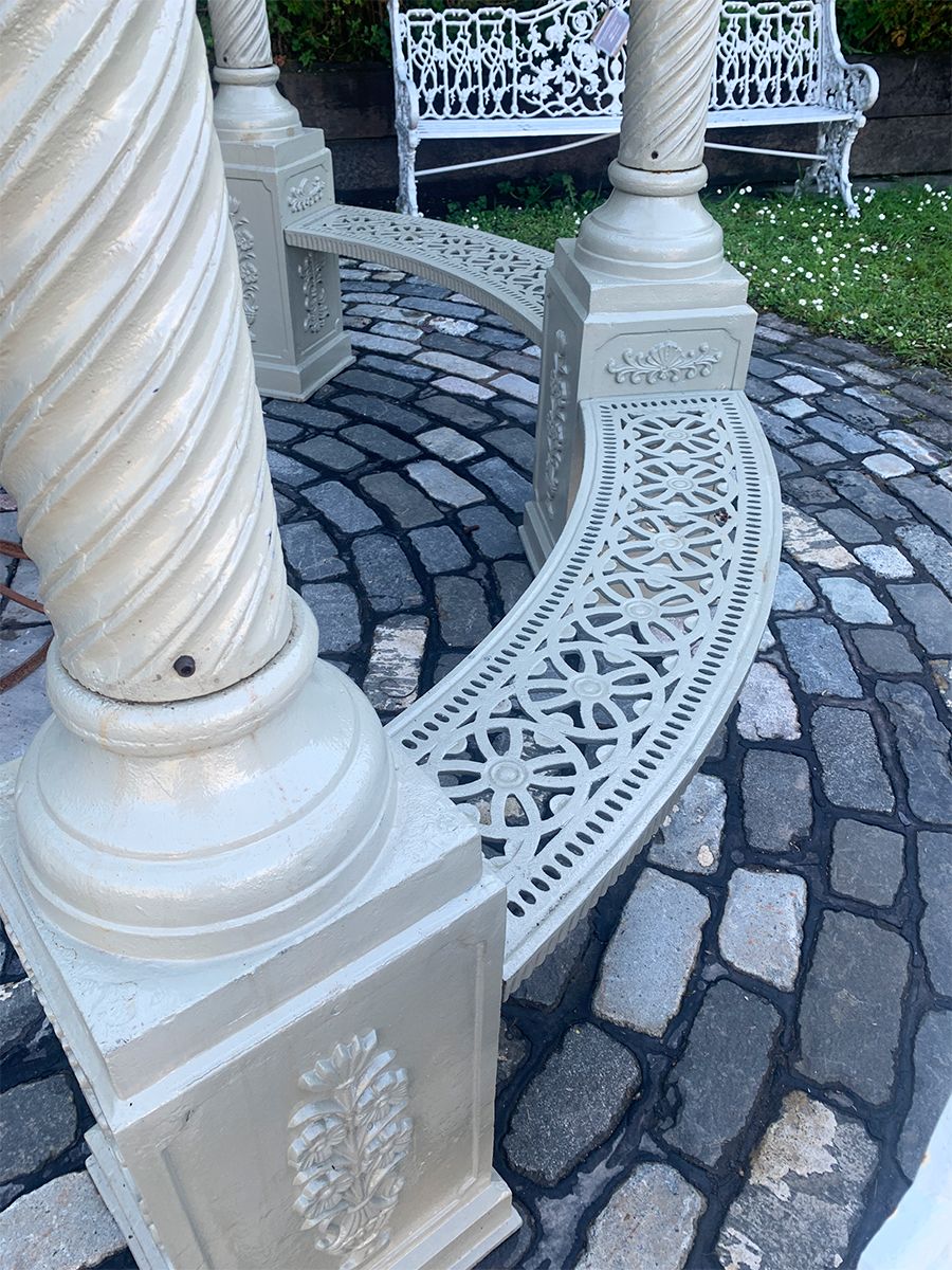 Large period style Victorian cast iron gazebo. Beautiful detailed cast iron columns with rounded benches, complete with a wrought iron roof.