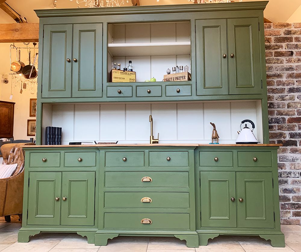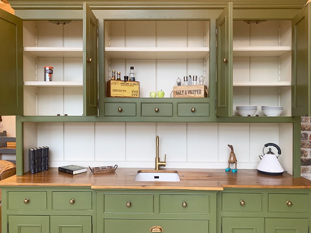 The base is break fronted, with an under mounted sink in the centre, multiple drawers and cupboard for maximised storage. A well-sealed reclaim wooden worktop has been used and the piece has been finished with aged brass knobs and cup handles, compliment the stunning green painted units.