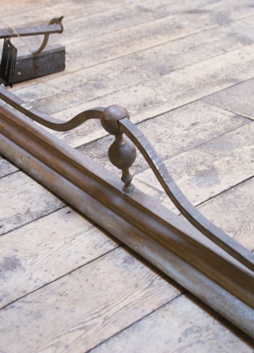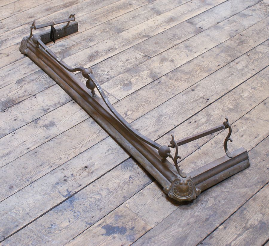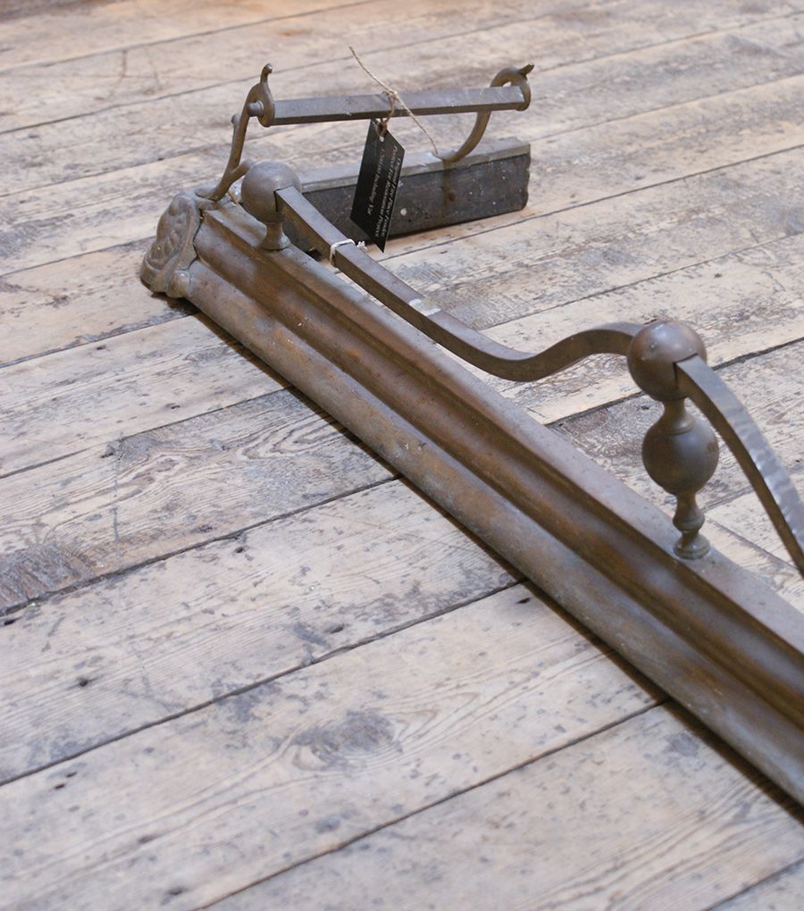 Original brass fire fender with sweeping detail, perfect for a restoration project