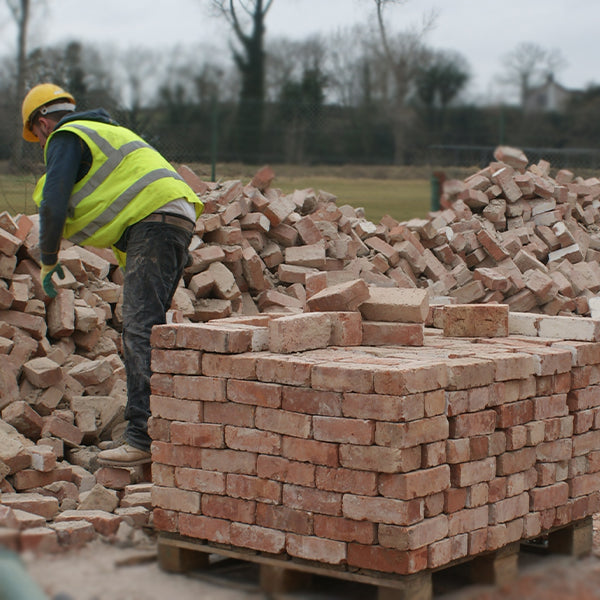 Reclaimed Brick are selected based on quality and built on new pallets containing 490 brick. These pallets are then wrapped for transport and labelled for indentification.