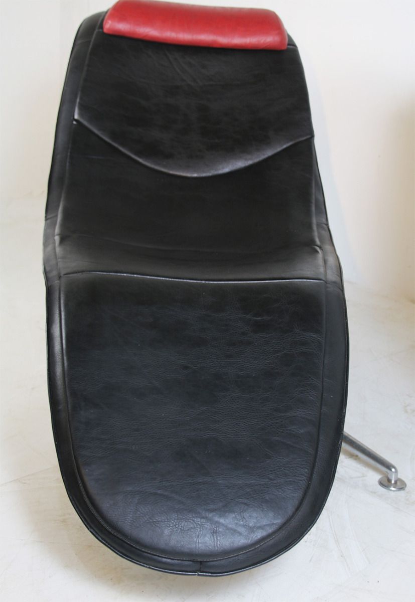 Stunning pair of vintage Chaise lounge leather chairs, with red leather fixed pillows. Standing on Chrome spider legs