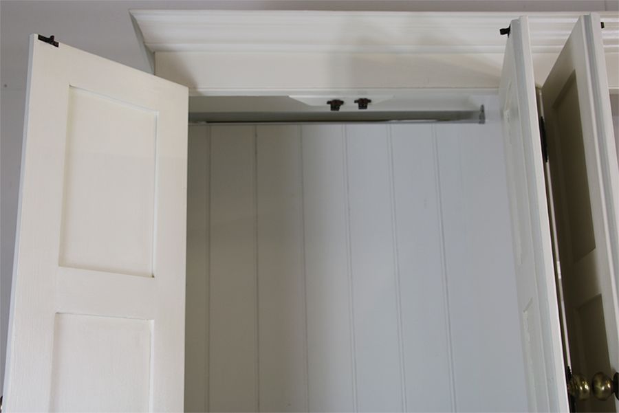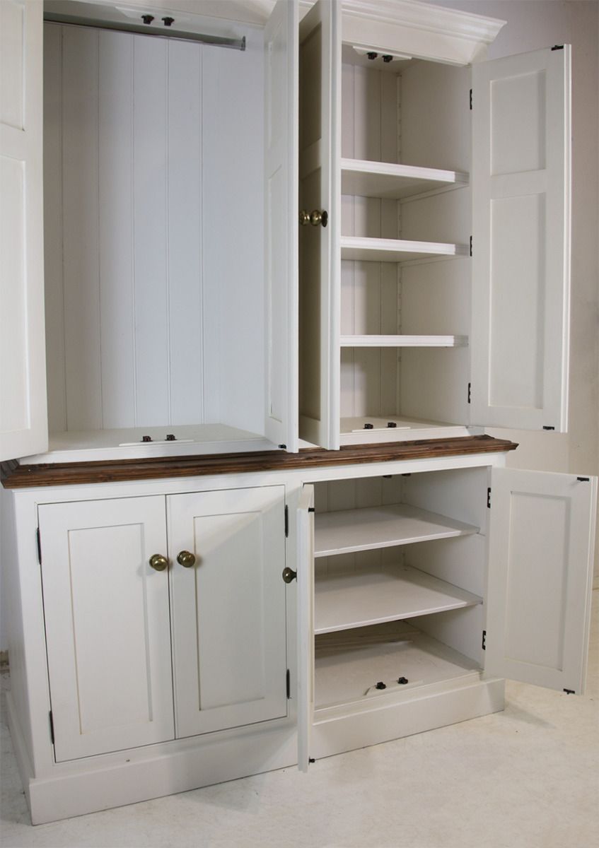 Pantry unit / larder storage unit with 2 over 2 cupboards with plenty of shelves and cupboards. Complete with hanging rail and finished with cornicing and brass embellishments.
