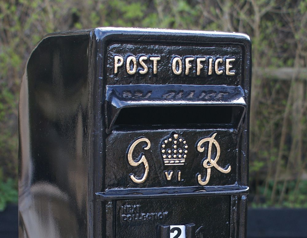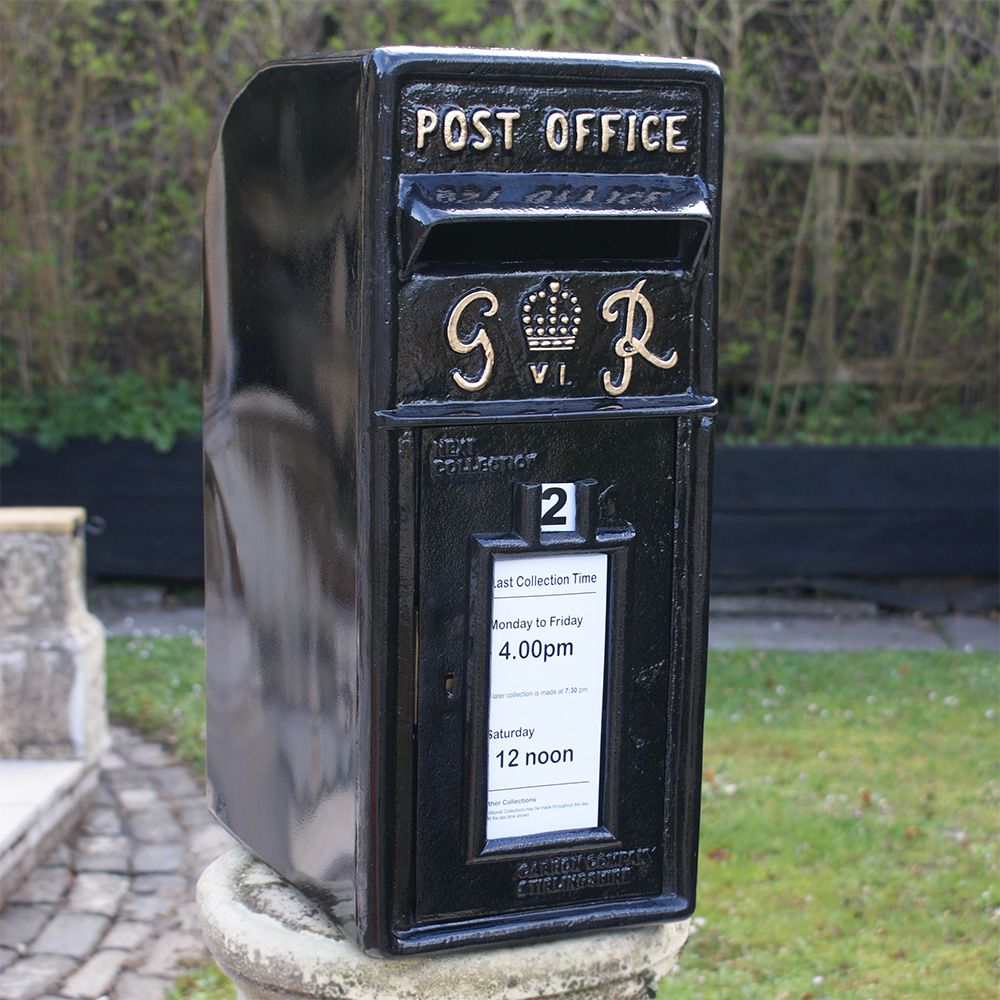 Black period style Royal Mail post box with cast iron front "GR". Complete with 2 keys and collections labels.