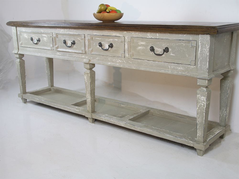 This Hungarian side server has a rich chocolate brown reclaimed parquet top and an amazing destressed painted finish