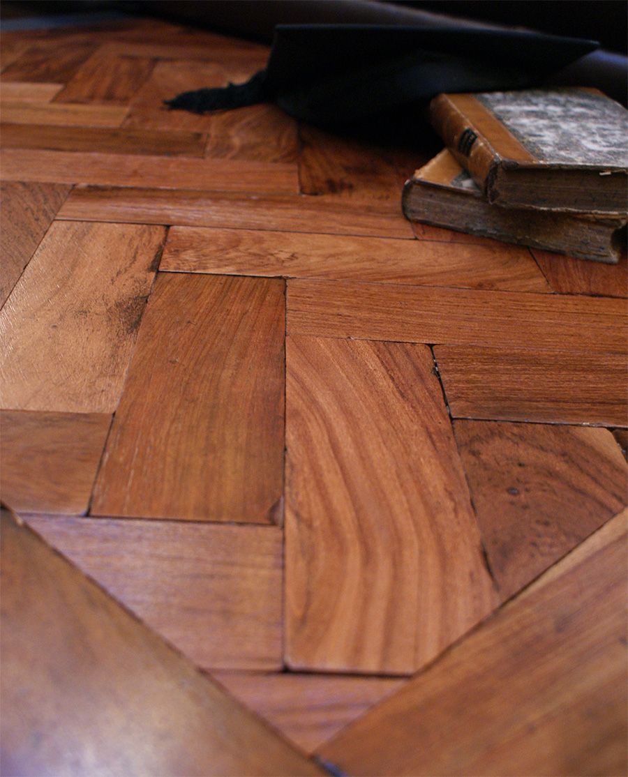 A rare salvaged tropical hardwood parquet reclaimed from Newcastle University