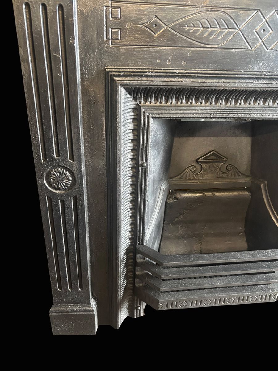 Restored Victorian cast iron fireplace with fluted legs and detailed centre frieze