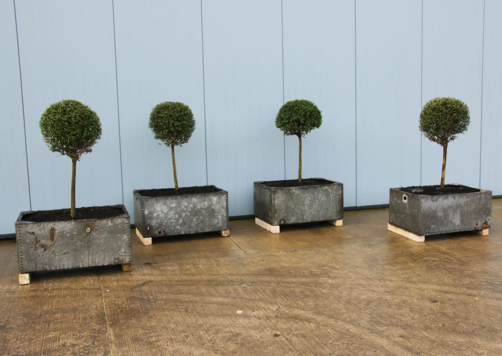 Matching set of 4 no stylish riveted industrial architectural planters, repurposed from 4 no 1930s water tanks