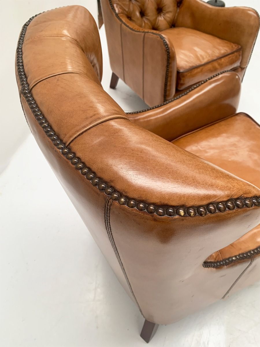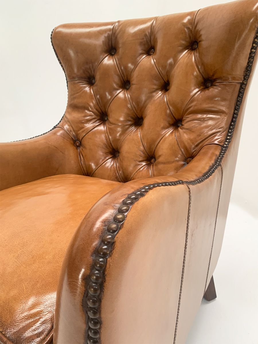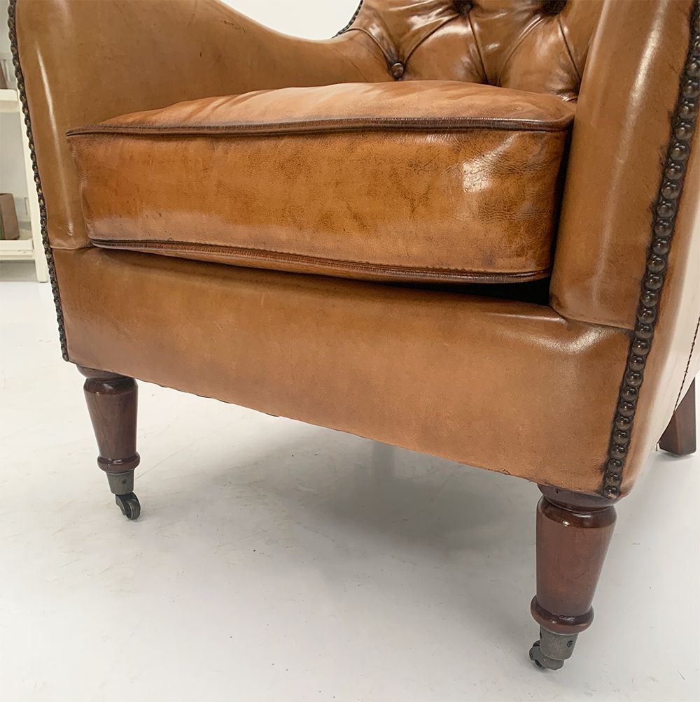 Period style button back armchairs in the finest quality leather complete with brass studding and brass castor wheels