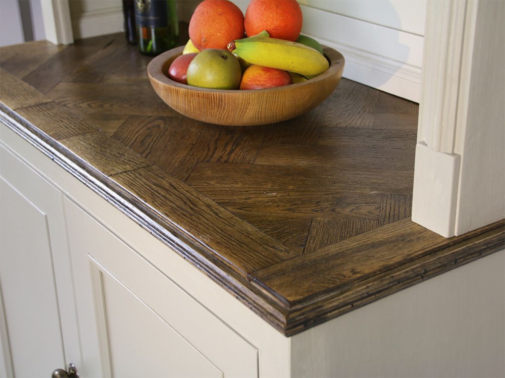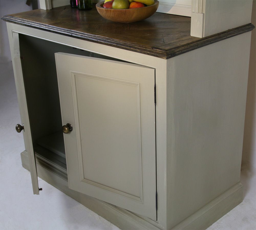 With a reclaimed parquet top over a double cupboard and standing on elegand shaped feet