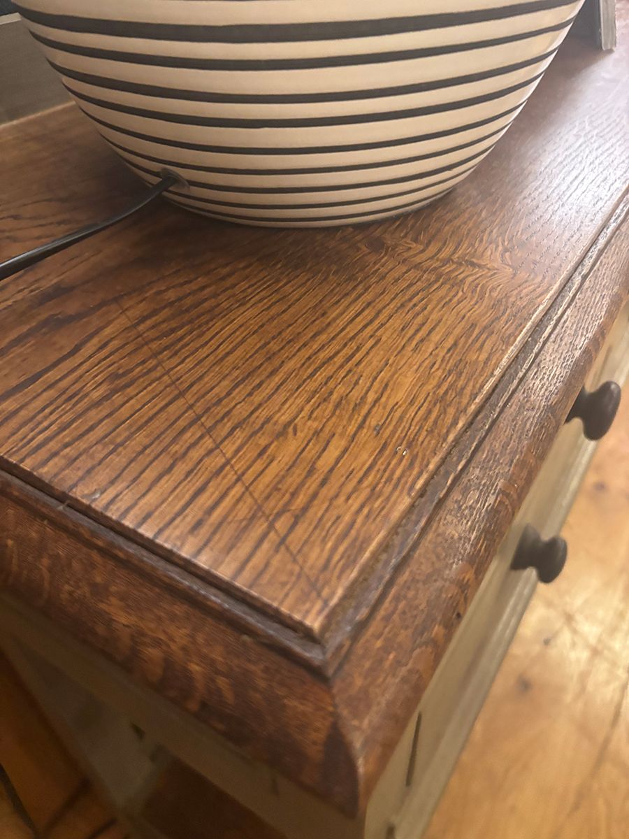 Beautiful 8 drawer side server with wooden knobs and a pot shelf below. Finished in a green tone.