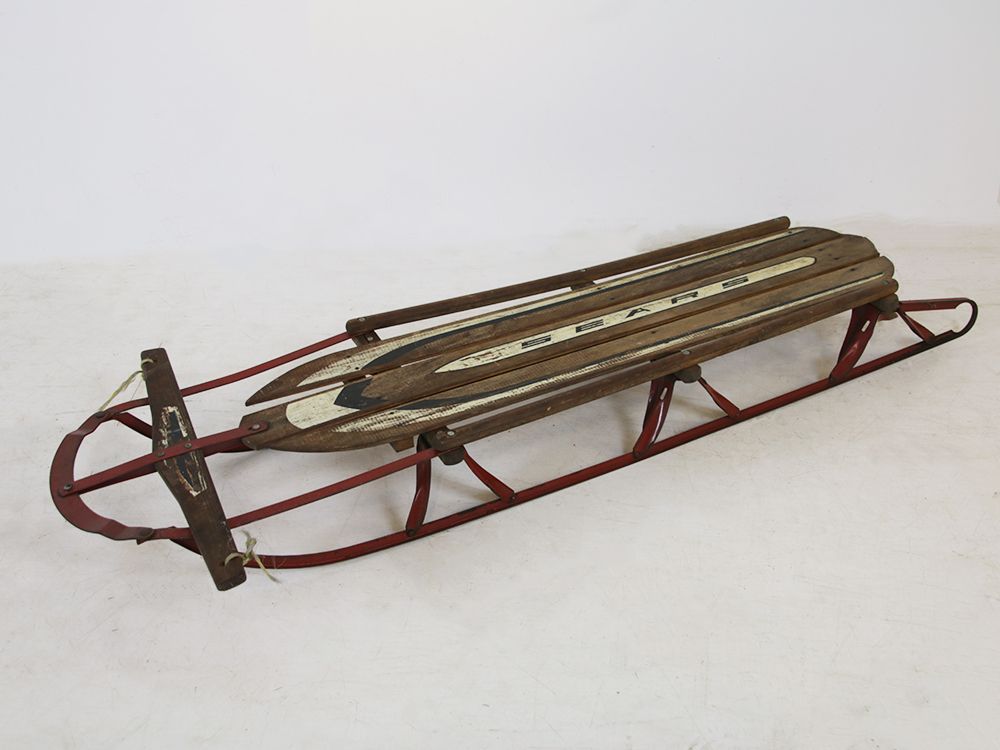 Vintage wooden sleigh with metal runners by sears, ideal for winter fun. Would also make a great commercial feature piece