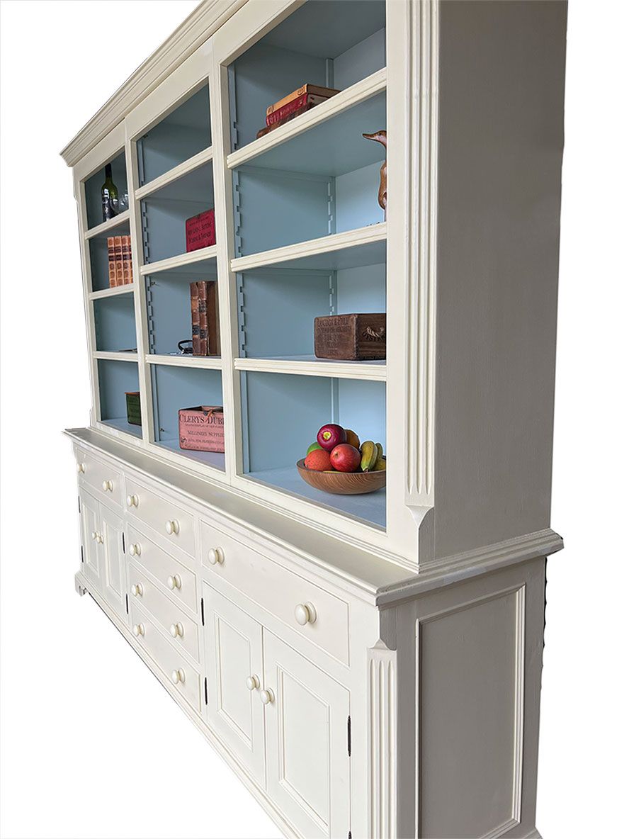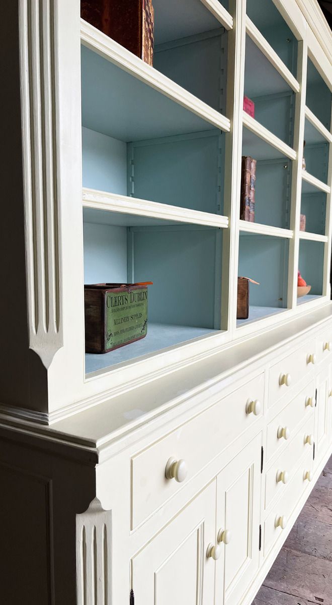 Large hand painted dresser with canted and fluted corners. Standing on bracket feet, with double cupboard & drawer above on each side & 4 drawers in the centre.